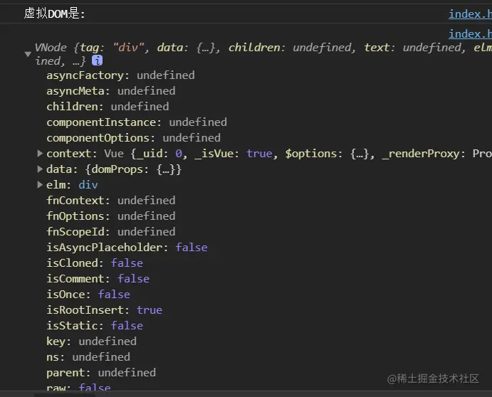 下图就是 Vue 创建的虚拟 DOM,也就是用一个对象来表示一个 DOM 结构