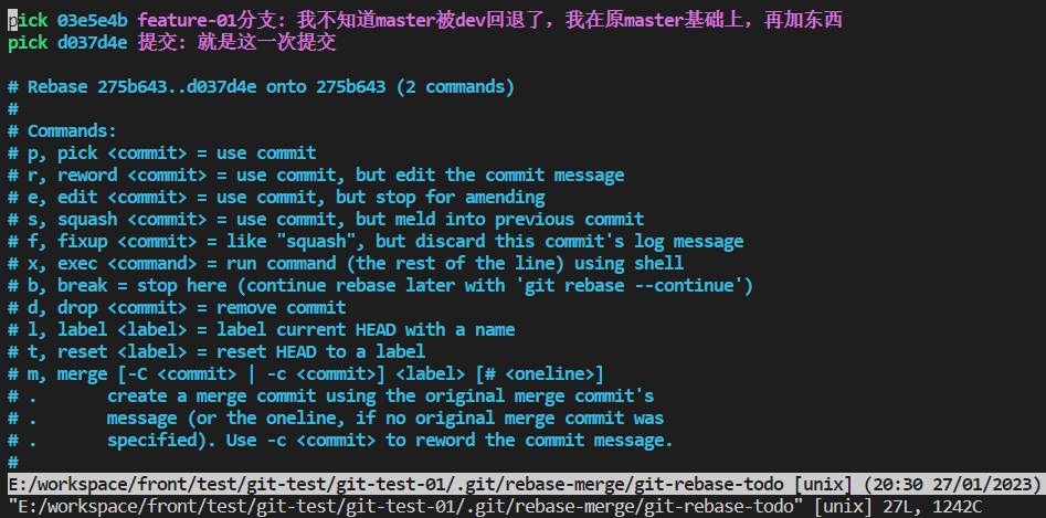 如下示例: 输入命令 git rebase -i 275b643, 则可以对这个commit id之后的所有 commit 消息进行修改