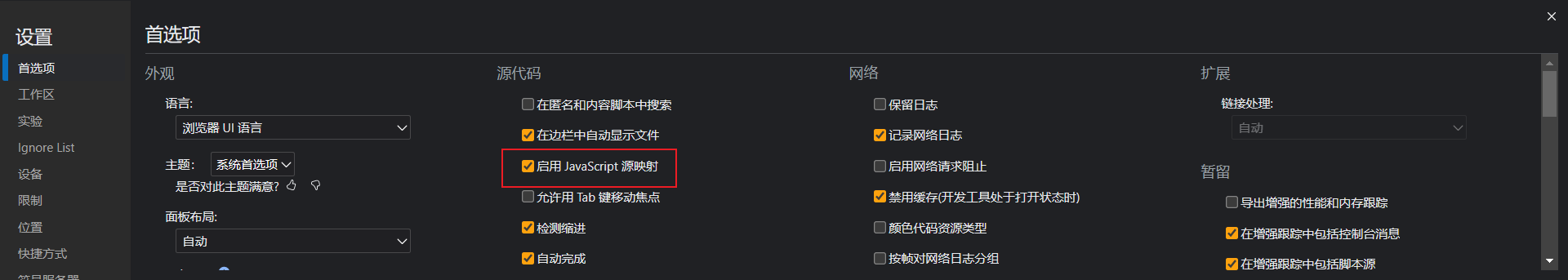 浏览器调试工具中的设置启用JavaScript源映射