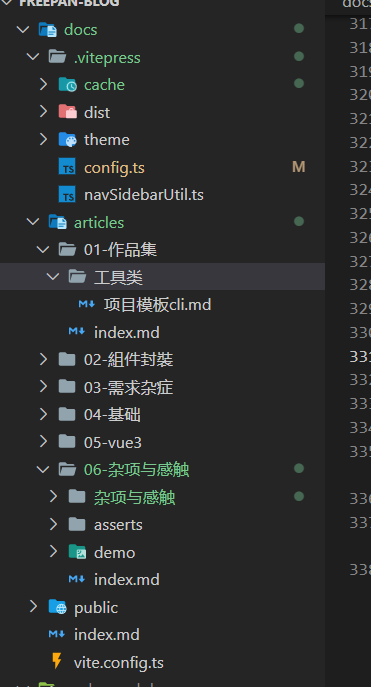 PROJECT_ROOT/docs/articles目录,并放入对应的子目录 PROJECT_ROOT/docs/articles的子目录是一级目录(如:01-作品集),这一级目录会被用来生成顶部导航PROJECT_ROOT/docs/articles/一级目录/index.md, 这是一级目录的首页, 该文件必须存在PROJECT_ROOT/docs/articles/一级目录/二级目录,二级目录用于生成左侧导航PROJECT_ROOT/docs/articles/一级目录/二级目录/xxx.md,xxx.md表示你的具体文章,文章必须放在二级目录下面- 无论是自动生成头部导航还是侧边导航,默认都会自动忽略